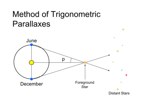 In the picture above, the line of sight to the star in December is different than that in June, when the Earth is on the other side of its orbit. As seen from the Earth, the nearby star appears to sweep through the angle shown. Half of this angle, is the parallax, p.