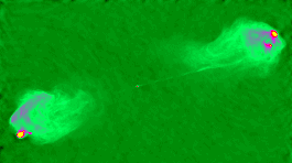 Now imagine that you see the accretion disk face-on, so that one of the jets is pointing straight toward you, and the other one (pointing away from you) is hidden by the accretion disk. In this case, with a jet pointing directly at you, you will receive a huge quantity of synchrotron emission. The resulting radio source is what we call a blazar.