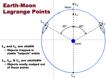 - Found 5 "islands of equilibrium" that orbit in lock-step with the main 2 bodies