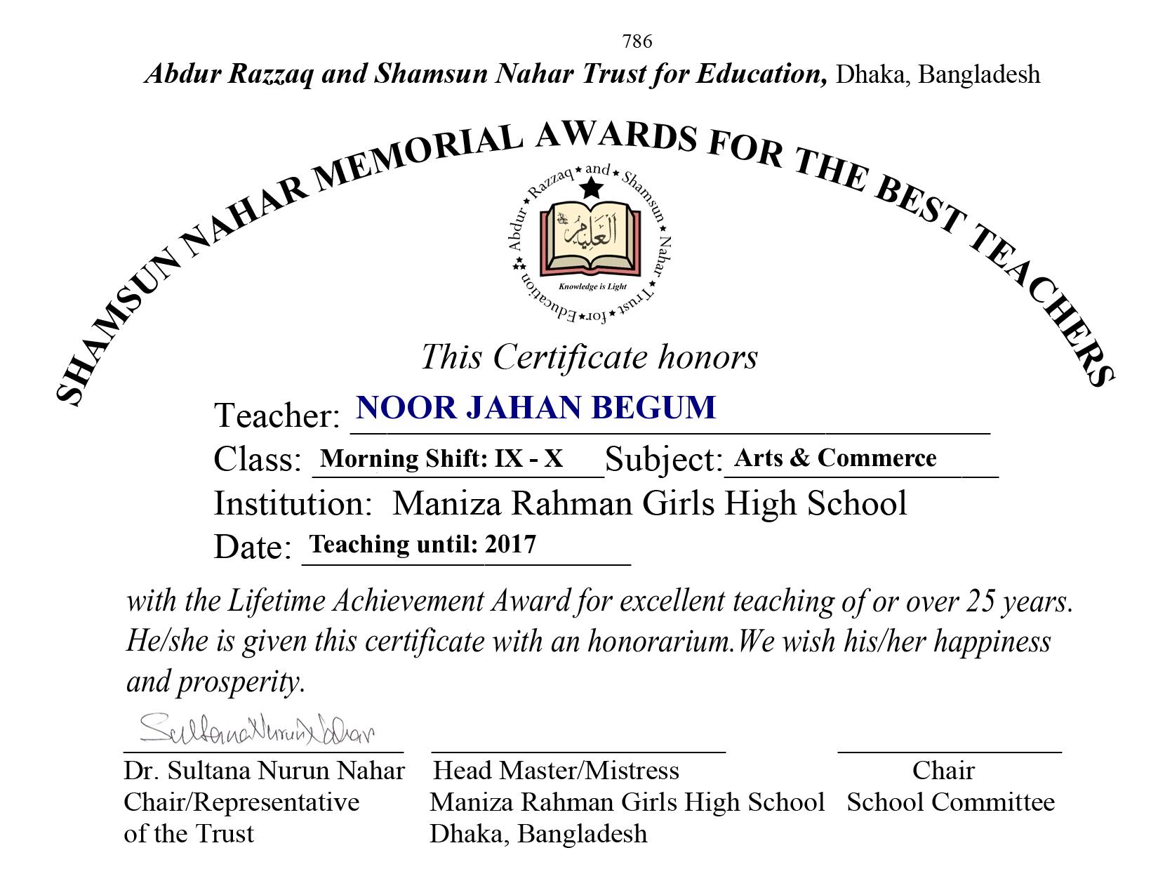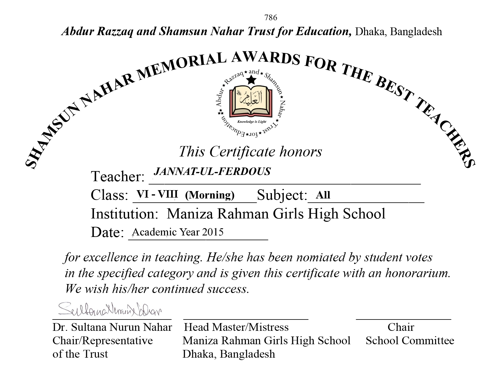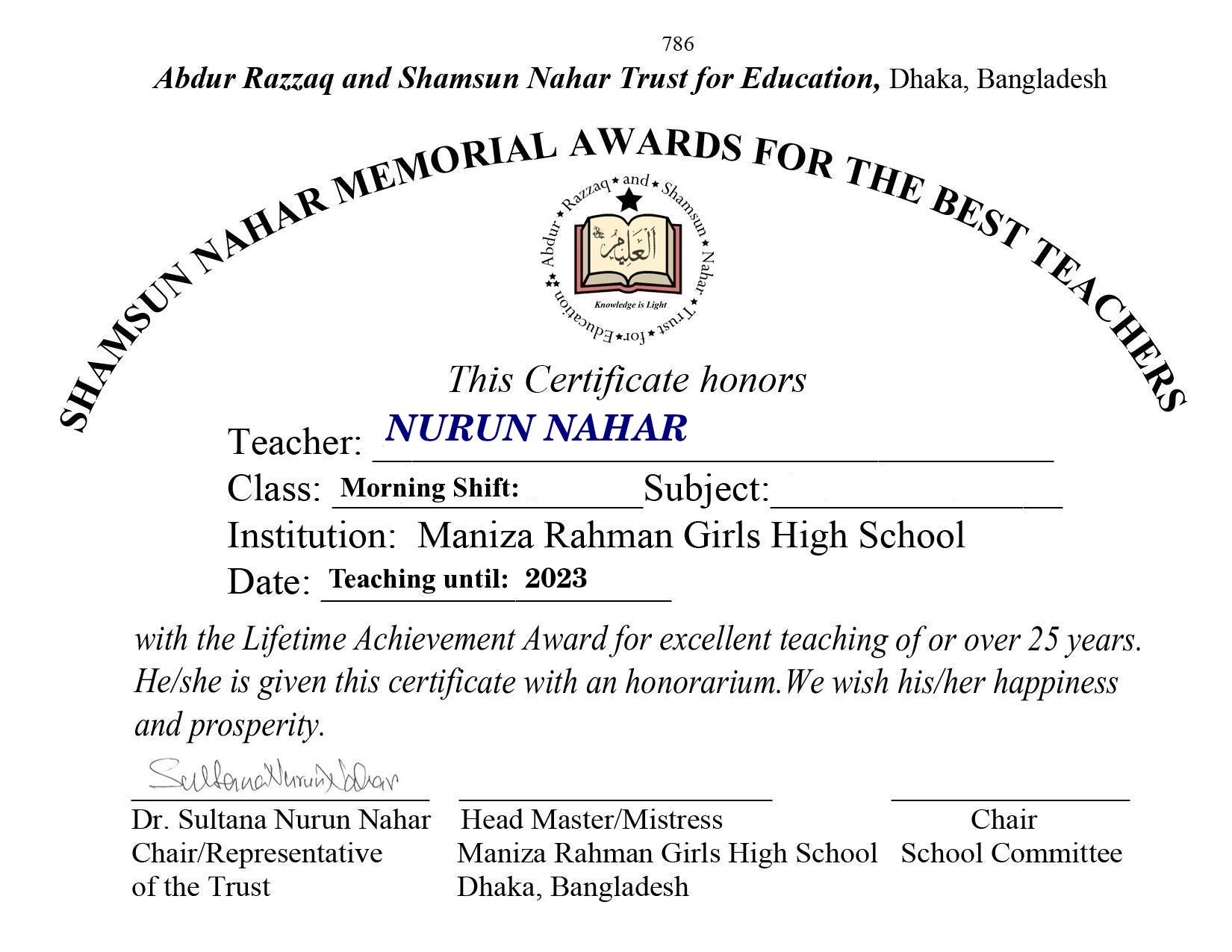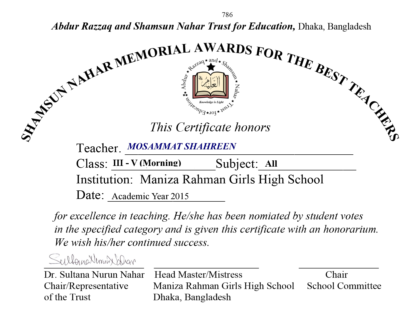 "Shamsun Nahar Memorial Awards for the Best Teachers" under the "Abdur Razzaq
