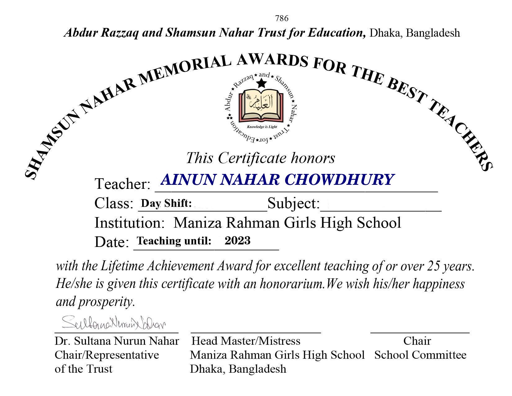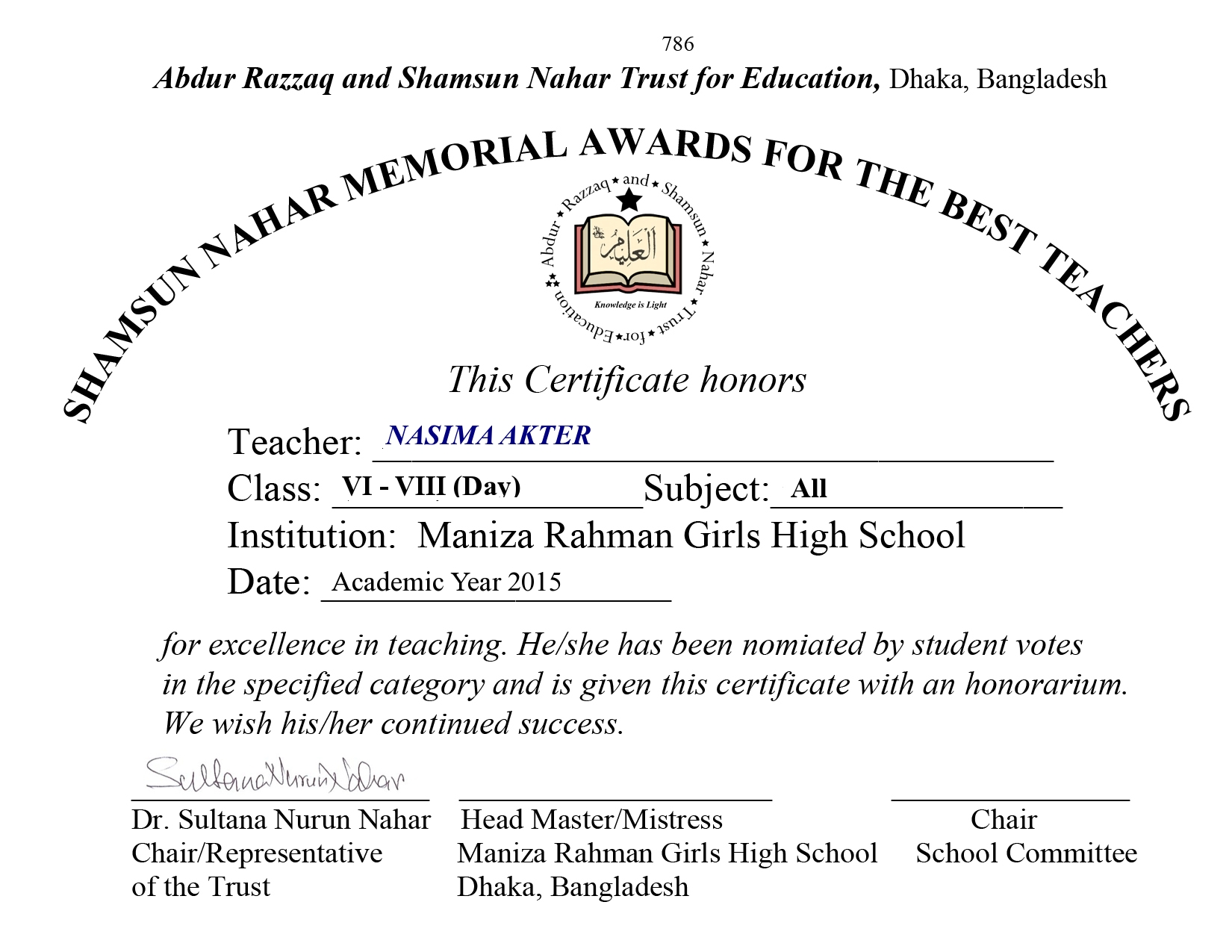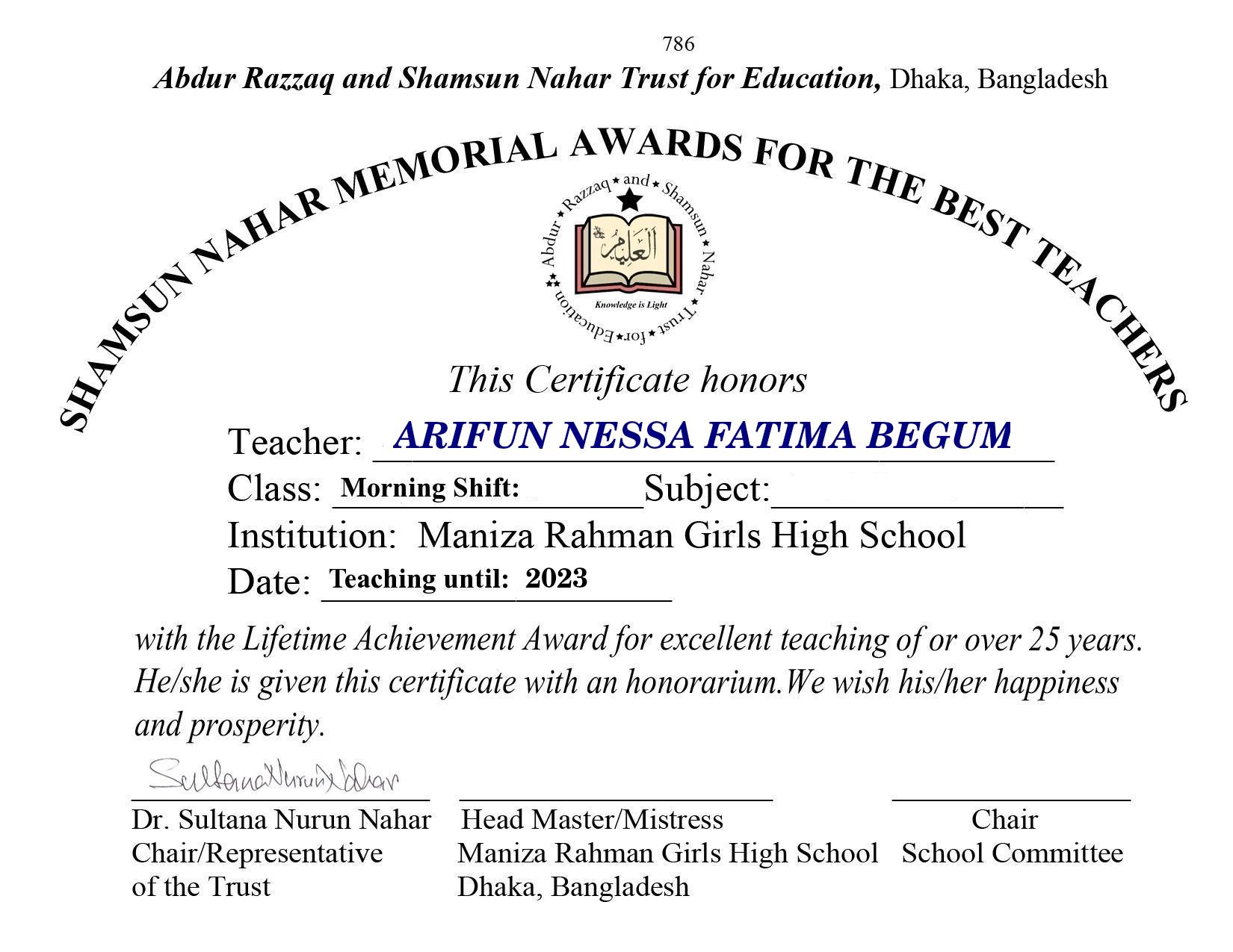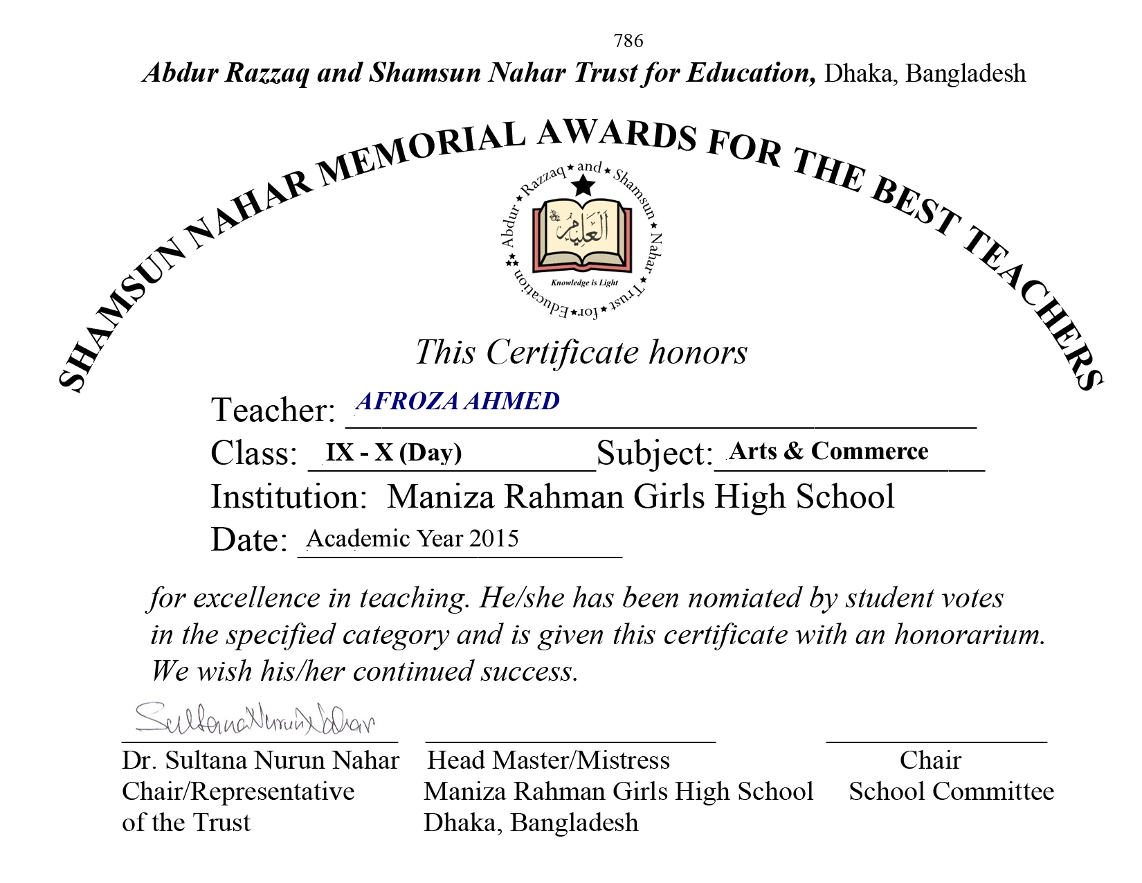"Shamsun Nahar Memorial Awards for the Best Teachers" under the "Abdur Razzaq