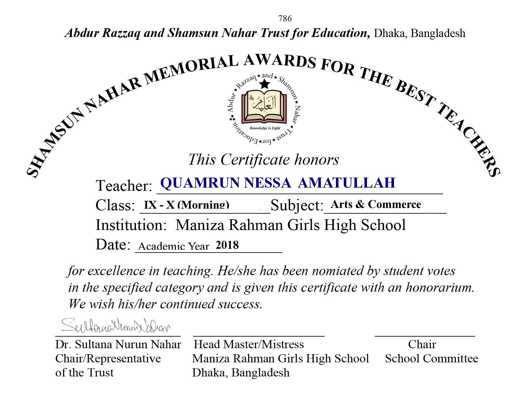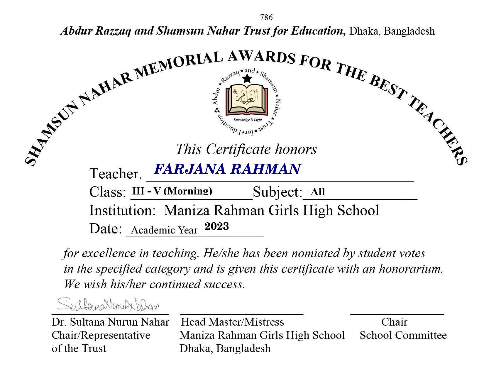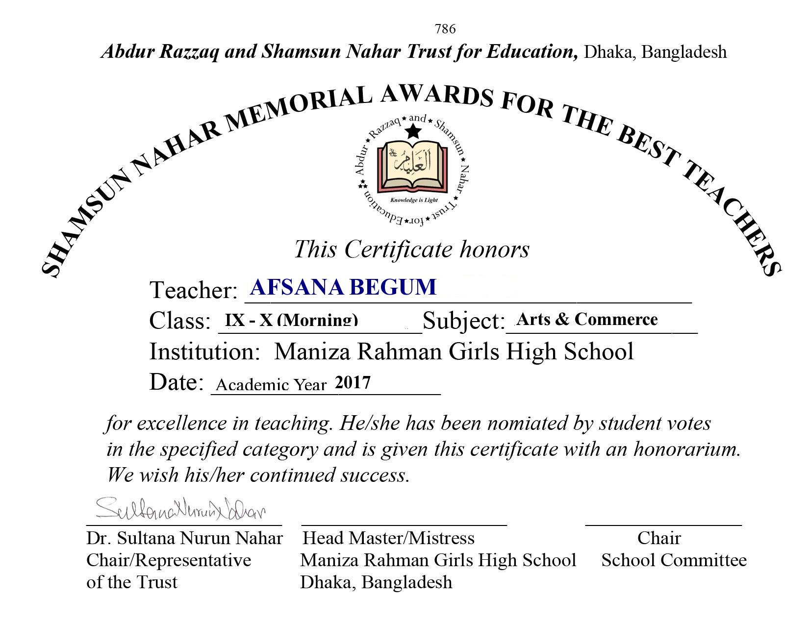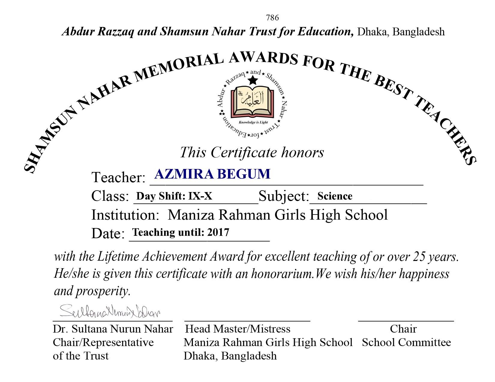"Shamsun Nahar Memorial Awards for the Best Teachers" under the "Abdur Razzaq