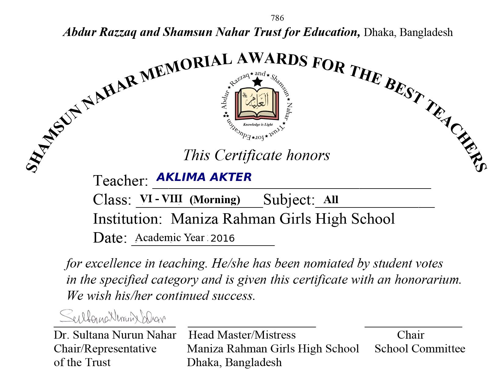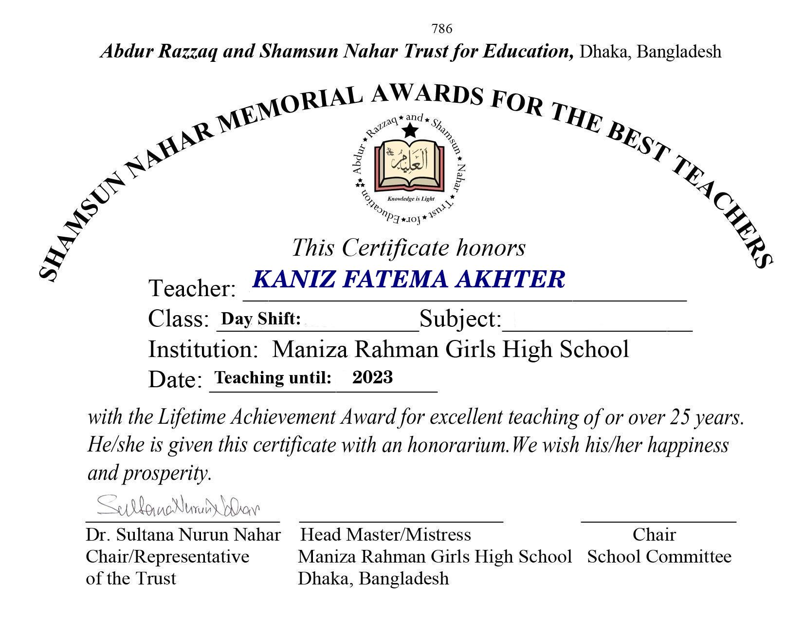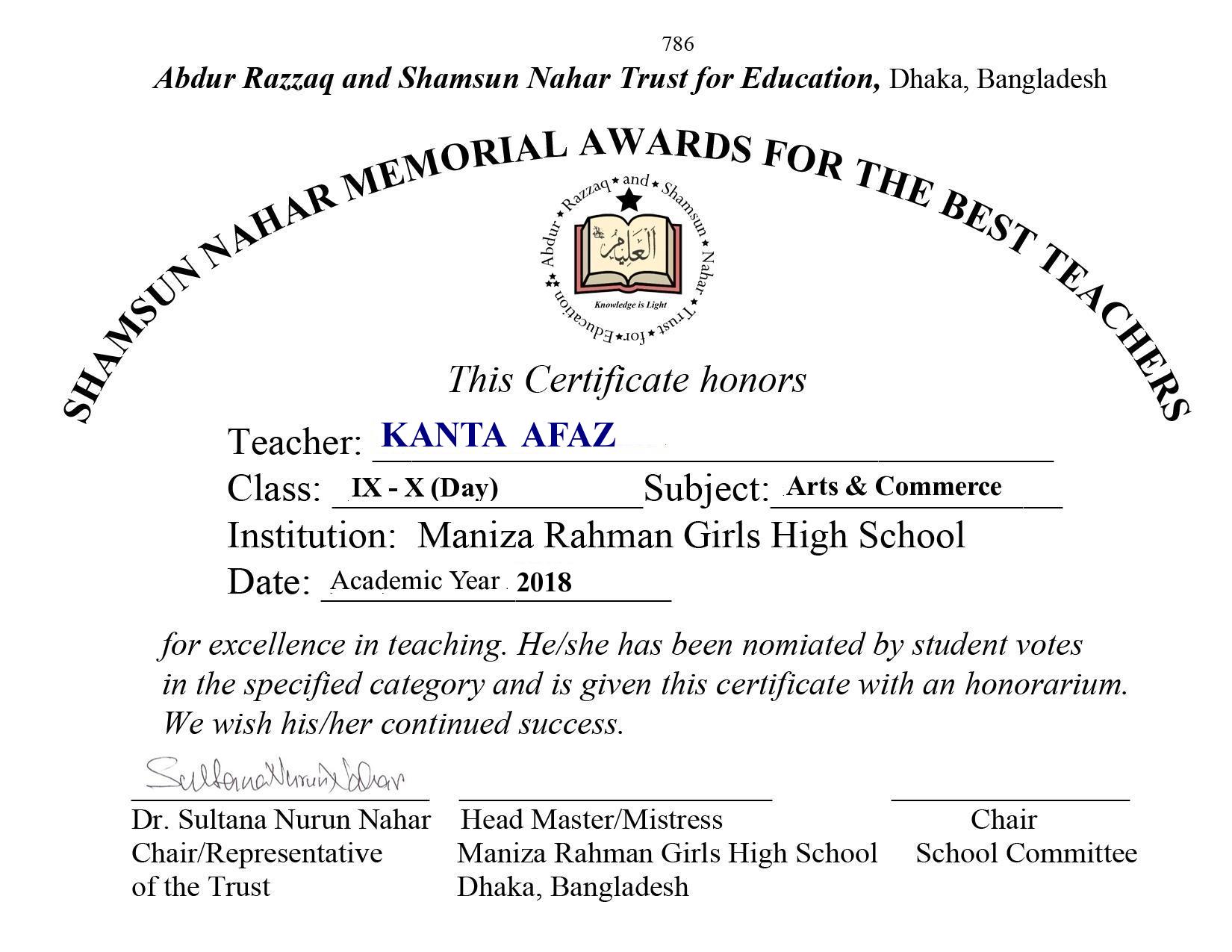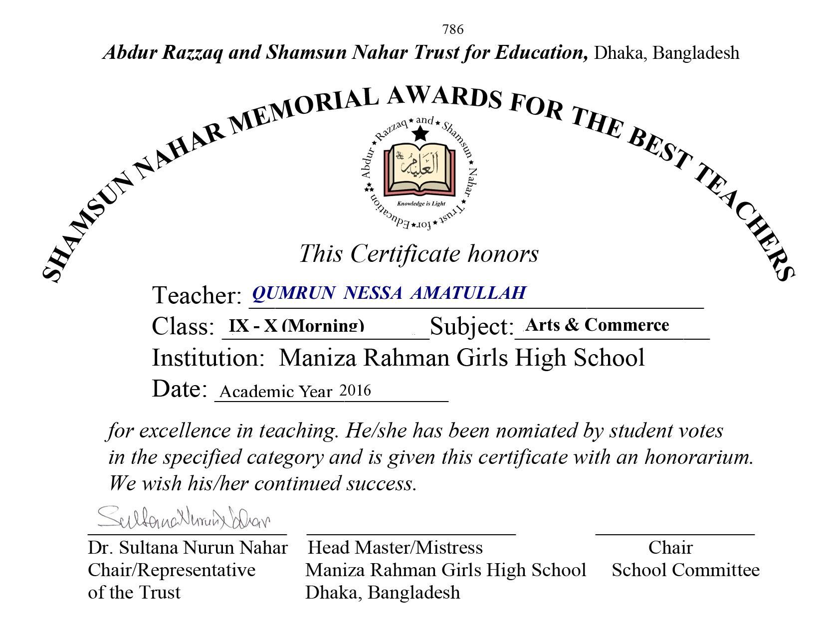 "Shamsun Nahar Memorial Awards for the Best Teachers" under the "Abdur Razzaq