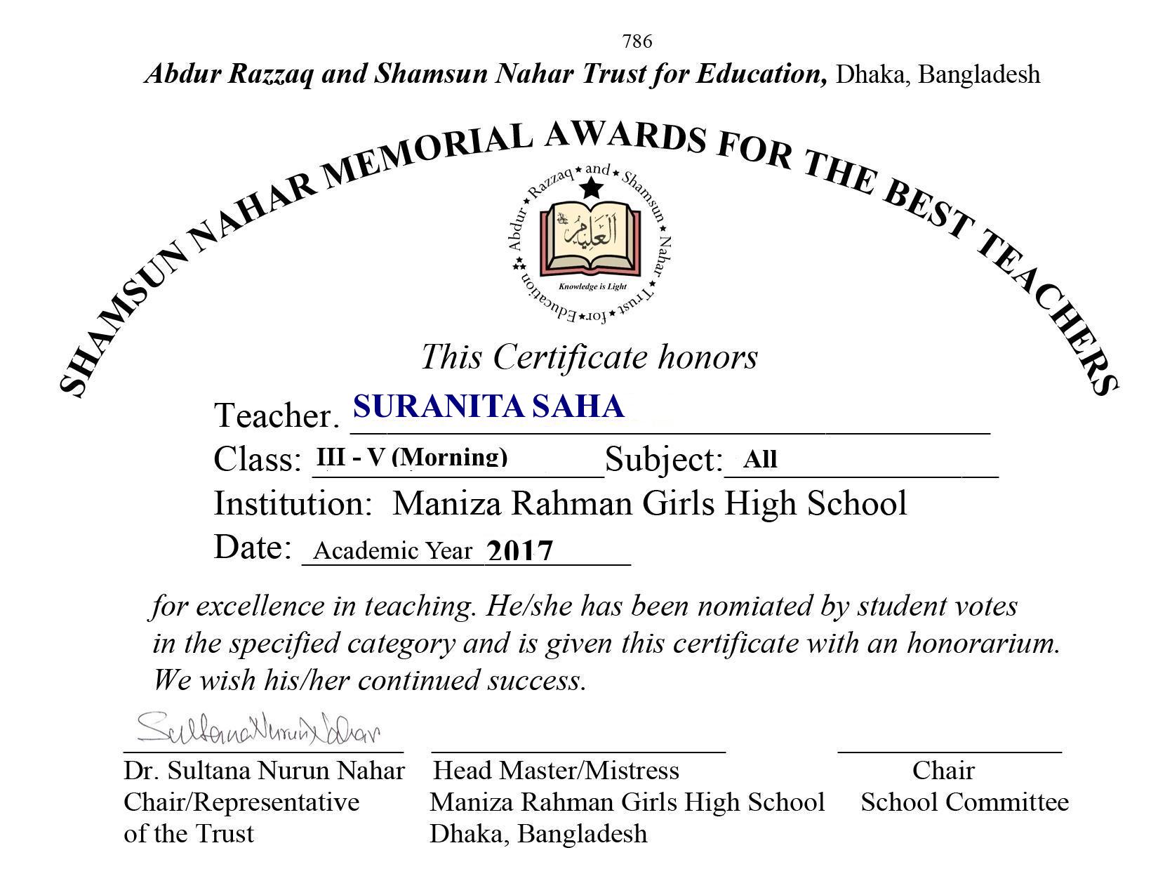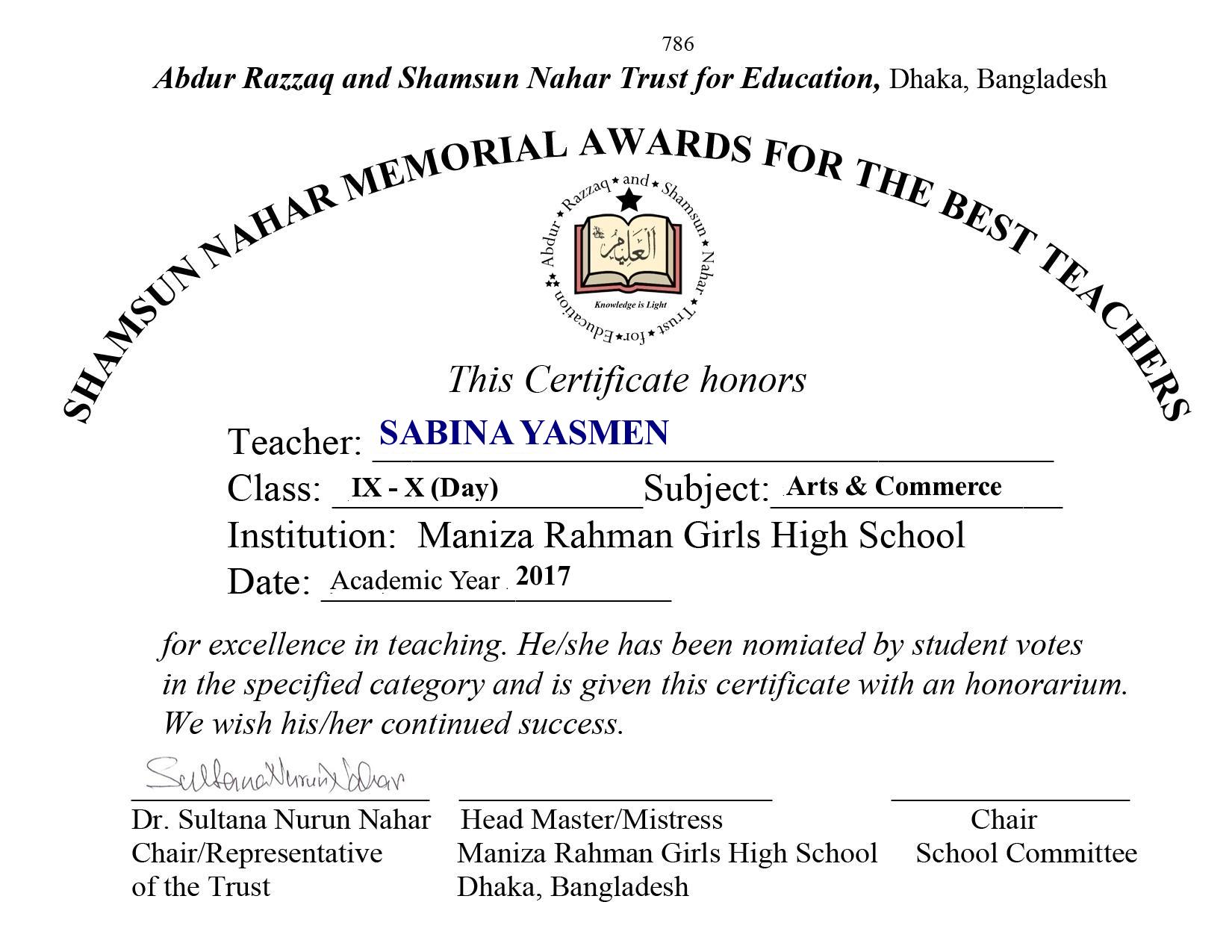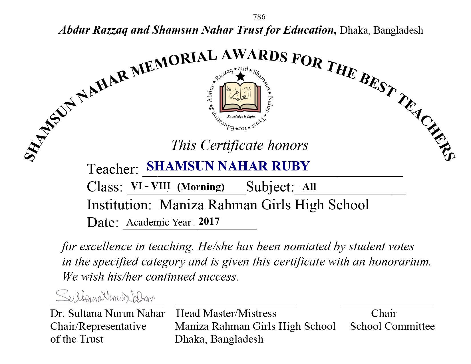 "Shamsun Nahar Memorial Awards for the Best Teachers"