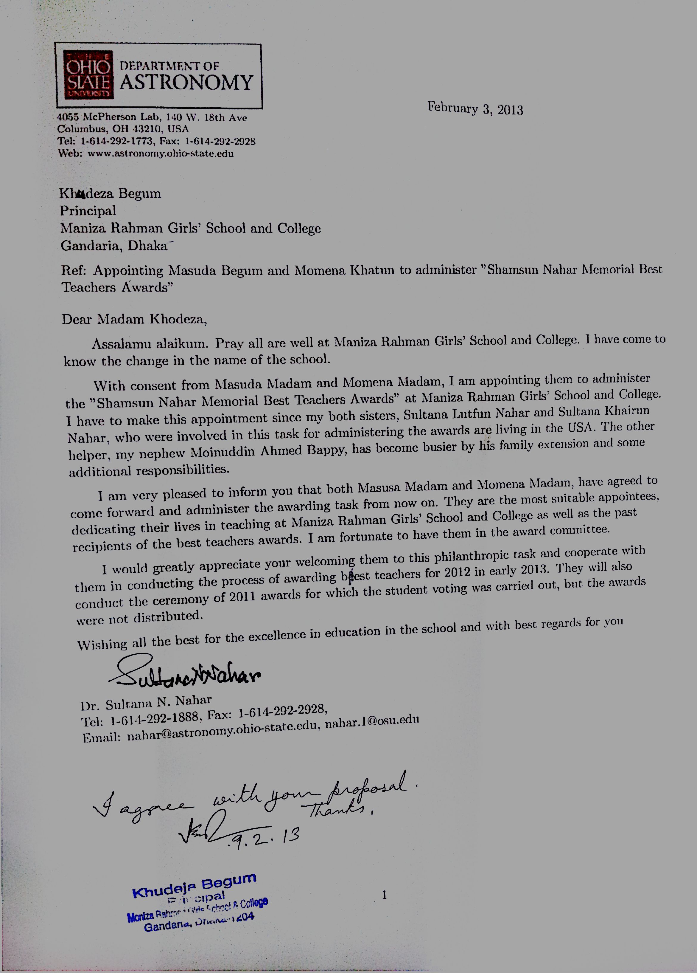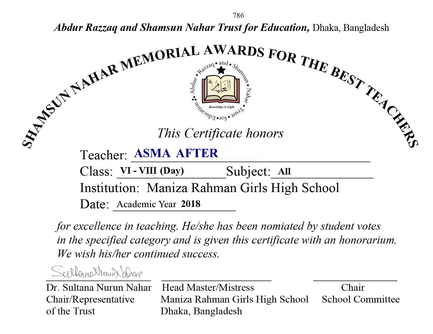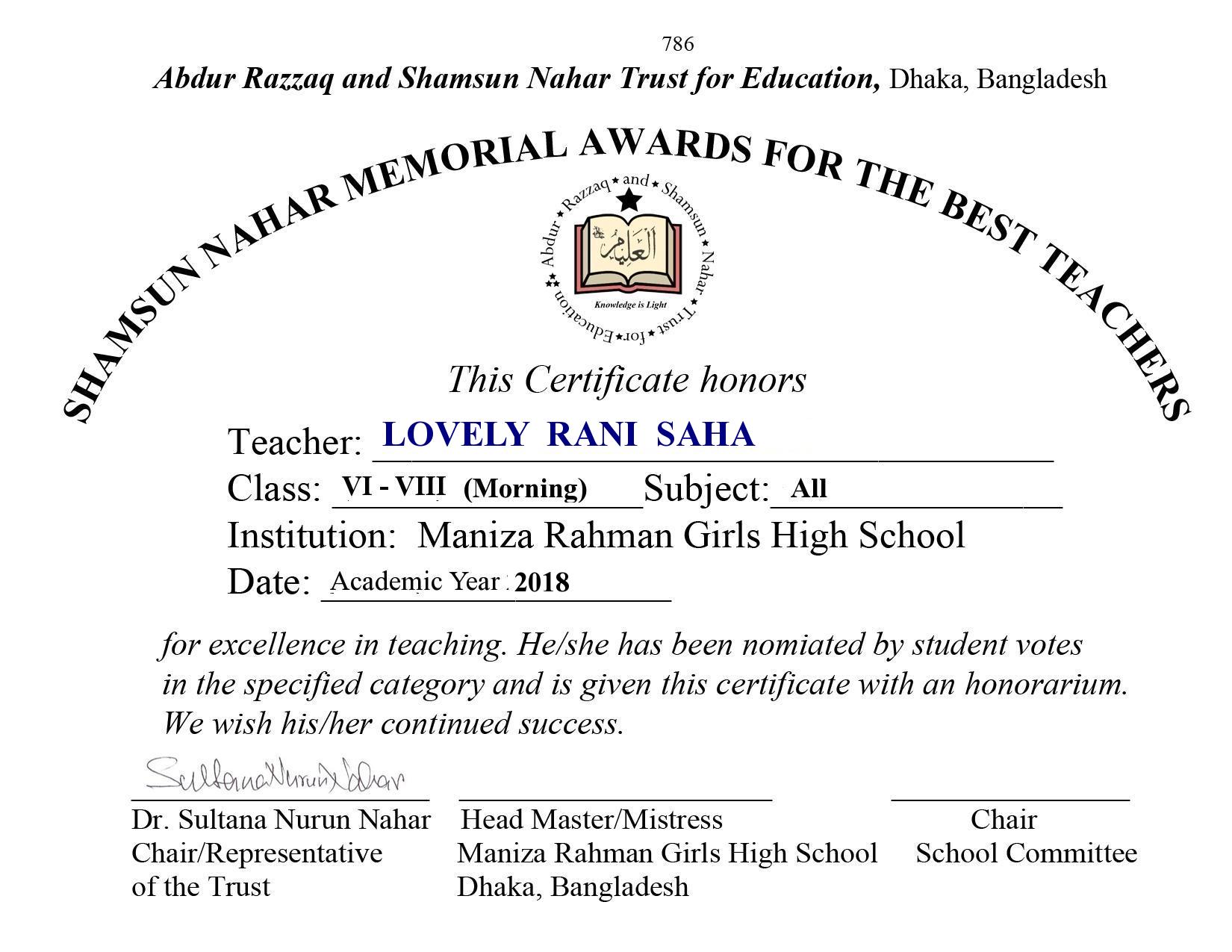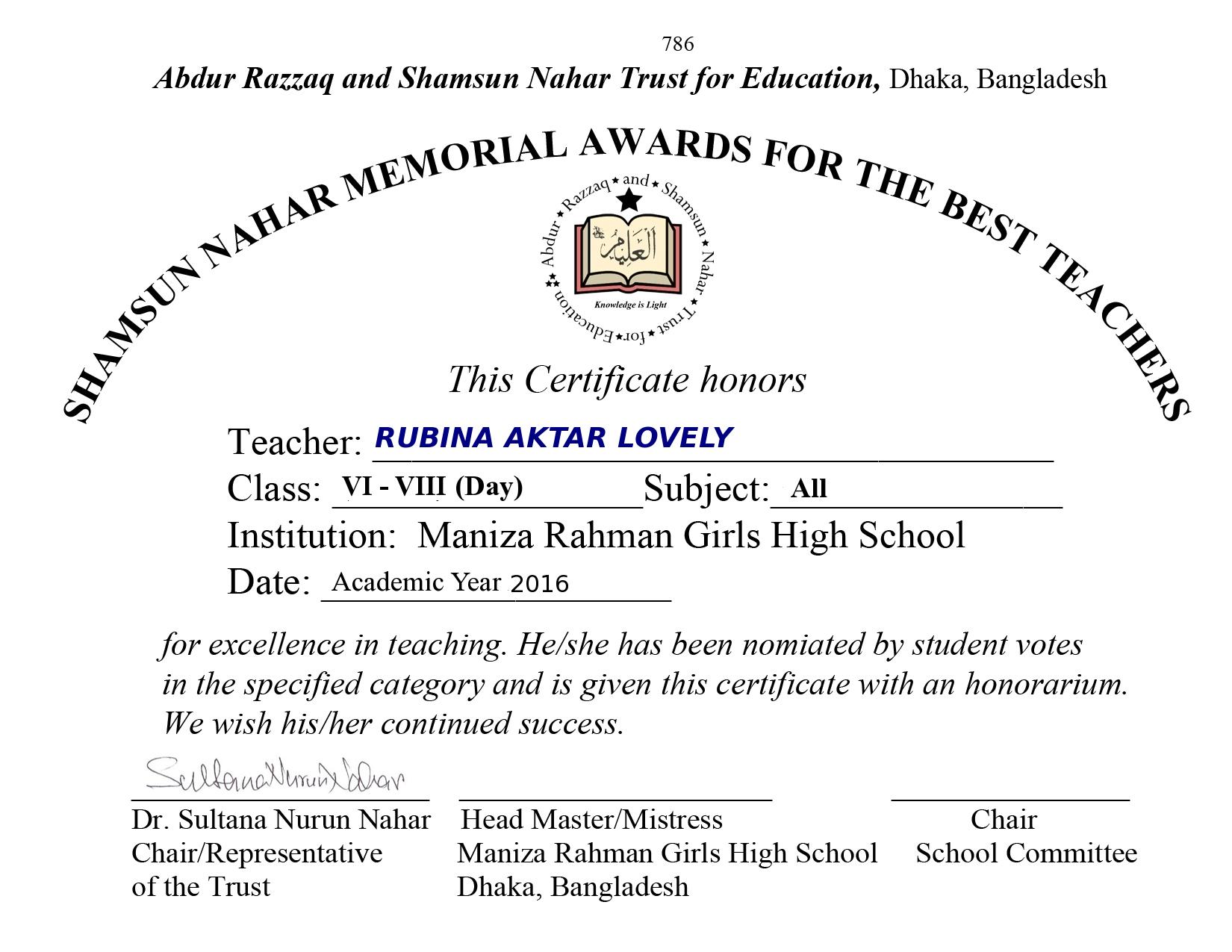 "Shamsun Nahar Memorial Awards for the Best Teachers"
