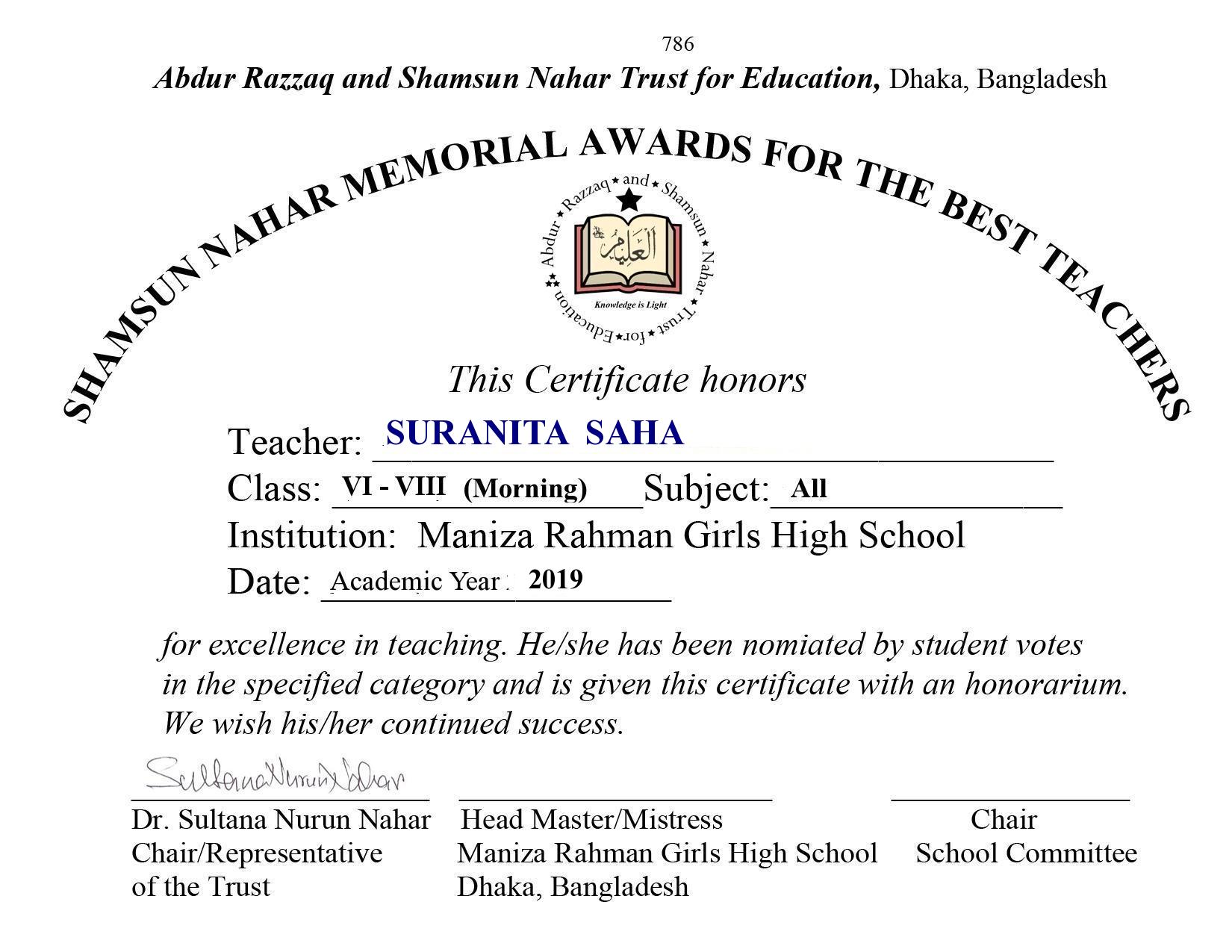 vi) Shamsun Nahar Ruby, (Classes VI-VIII, Morning Session)