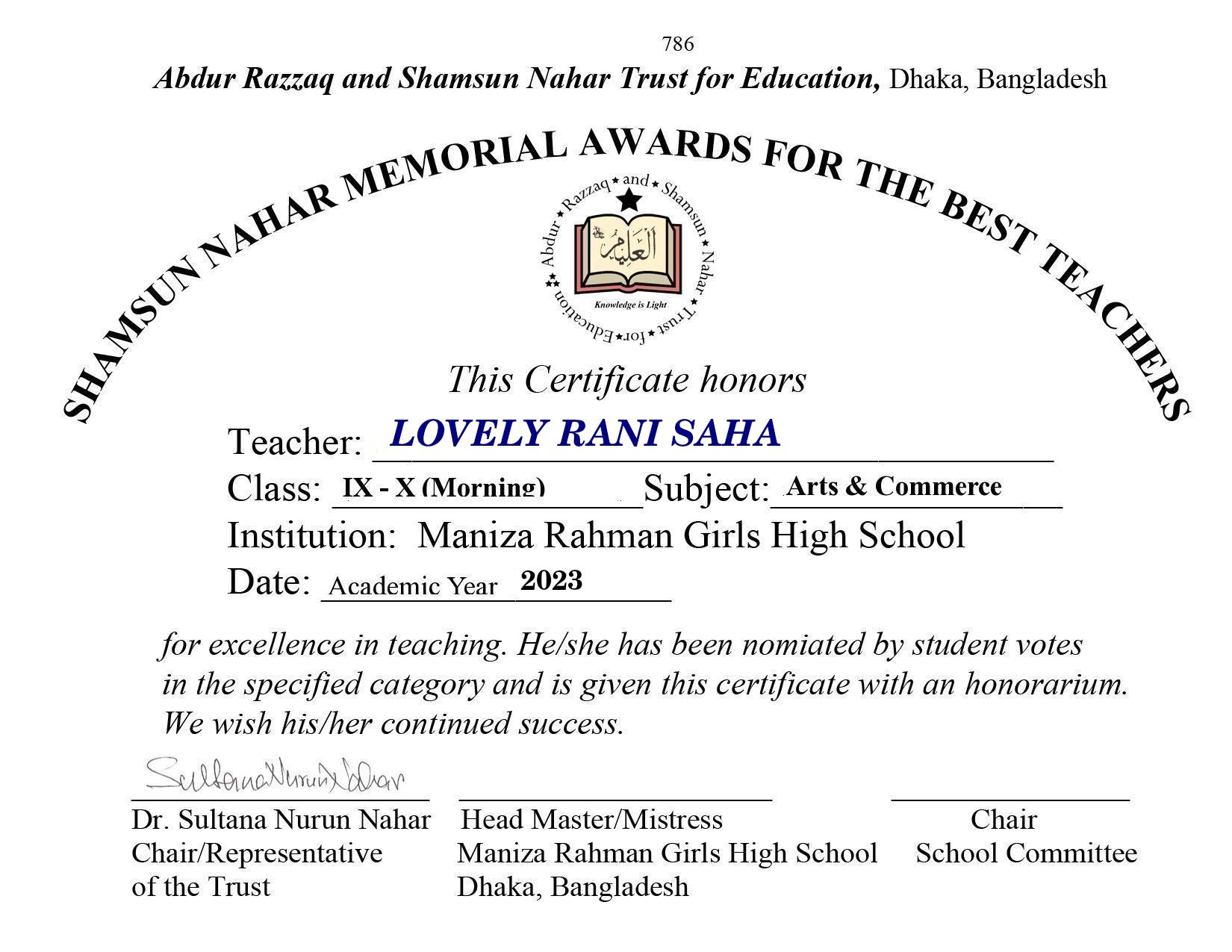 iv) Shamsun Nahar Ruby (Math & Science, Classes IX-X, Morning Session)