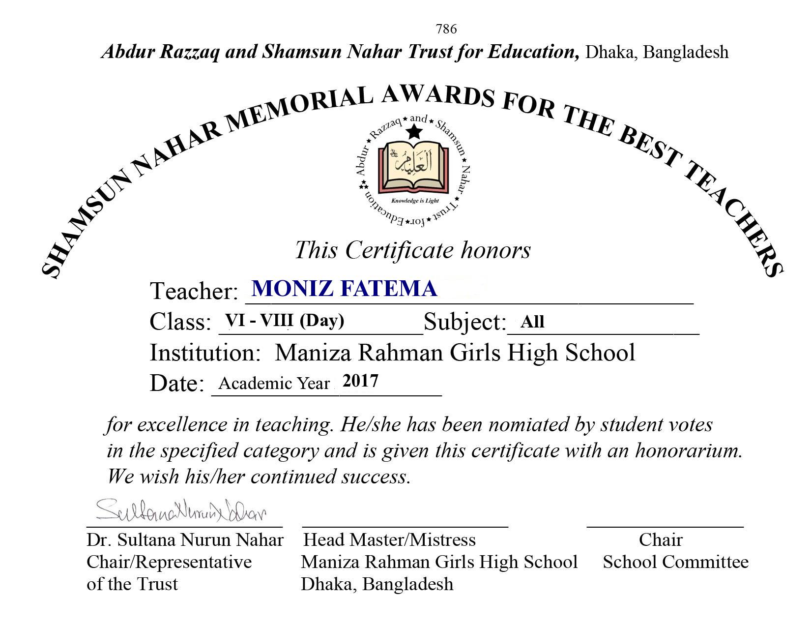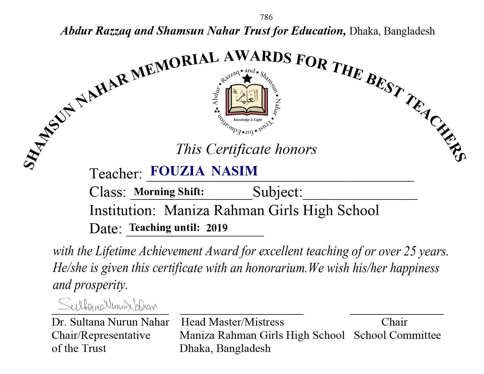 Recipients of "Shamsun Nahar Memorial Best Teachers Awards" at Maniza