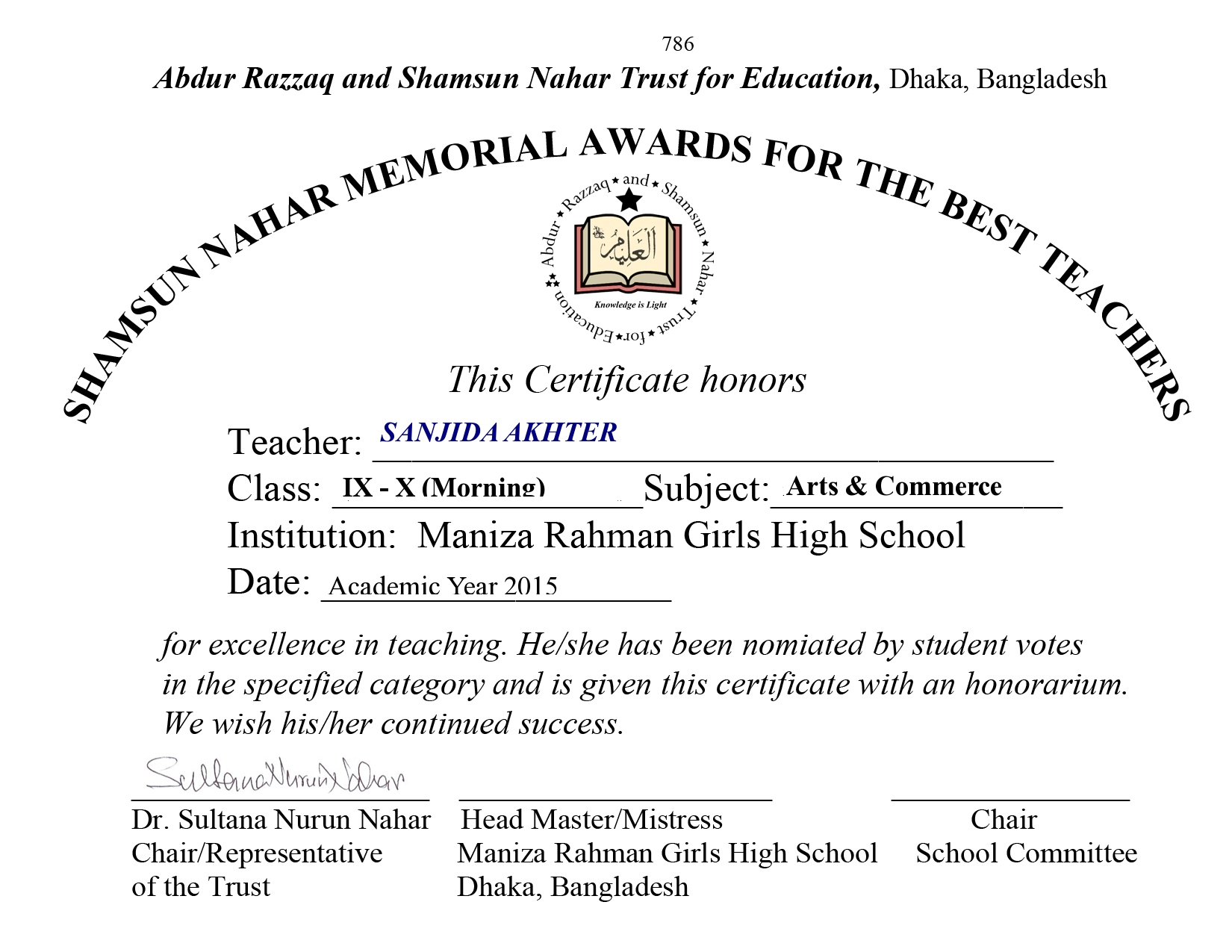 v) Sanjida Akhter, Commerce Classes IX-X, Morning Session)