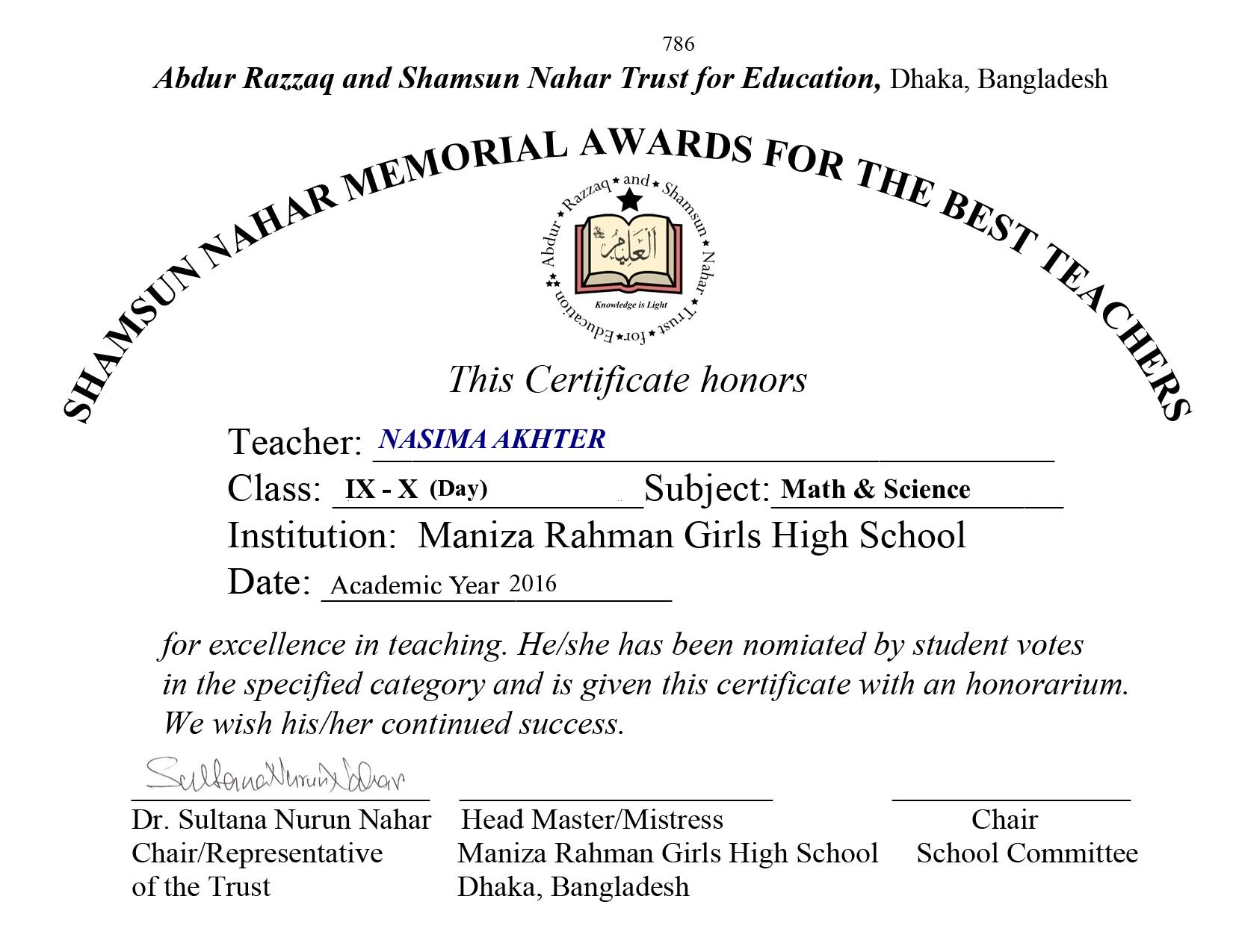 i) Nasima Akhter (Math & Science, Classes IX-X, Day Session)