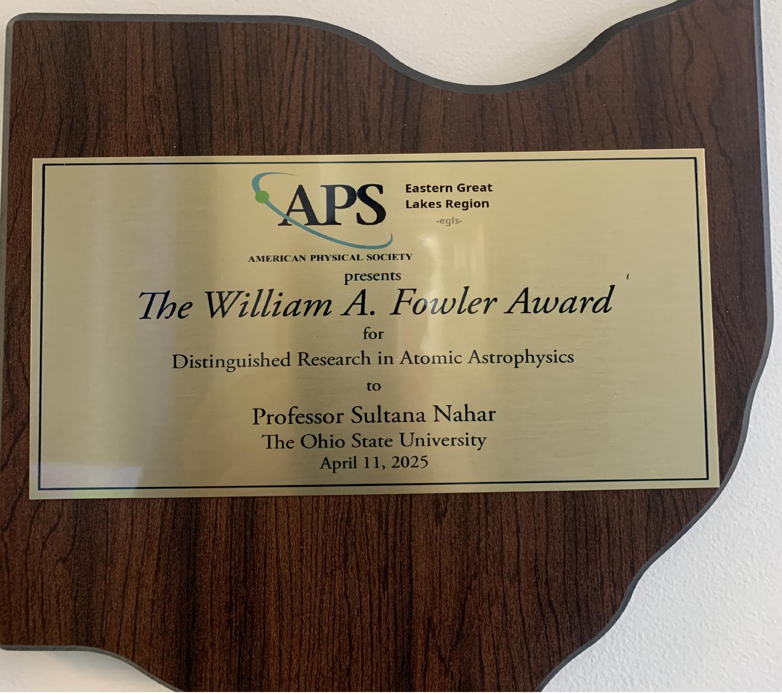 Distinguished Research in Atomic Astrophysics (plaque)", APS, 2025