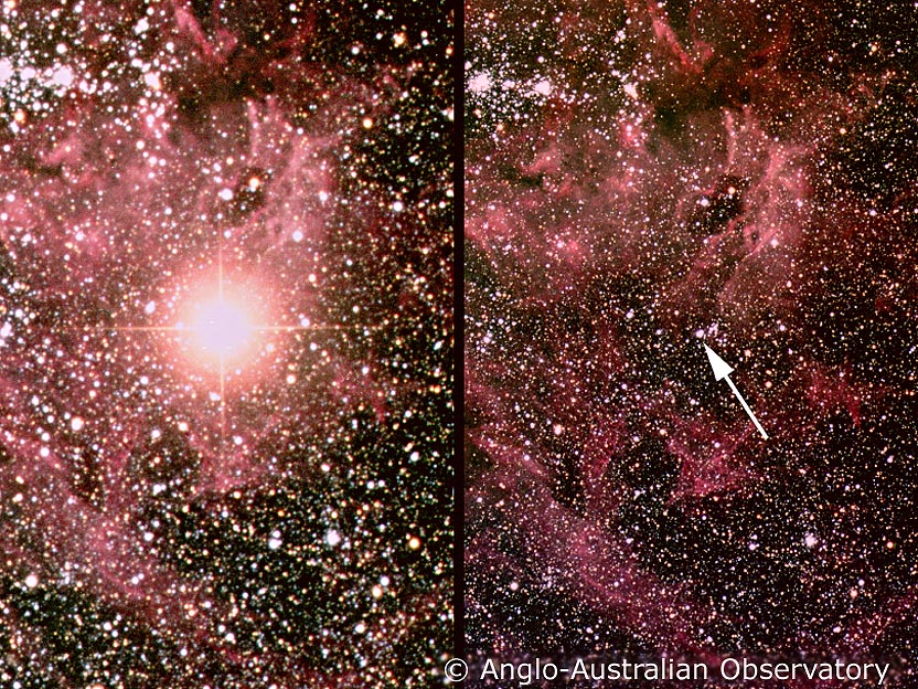 Supernova 1987a in the Large Magellanic Cloud (LMC). On the right,
