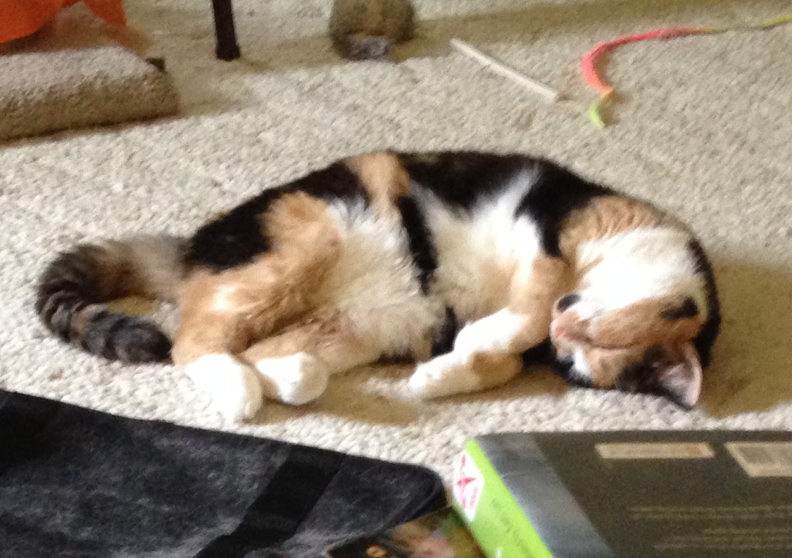 She loves to play, especially Lurk Somewhere And Then Attack, Run Through The Cat Tunnel, Chase the Tarantula (spider attachment on Da Bird), and Chase the Zen Mousie (Da Bird, no attachment at all). It really should be Zen Tarantula, but we call it Zen Mousie in honor of Merry (1997-2014), who loved Da Bird with and without a furry mouse-like attachment.